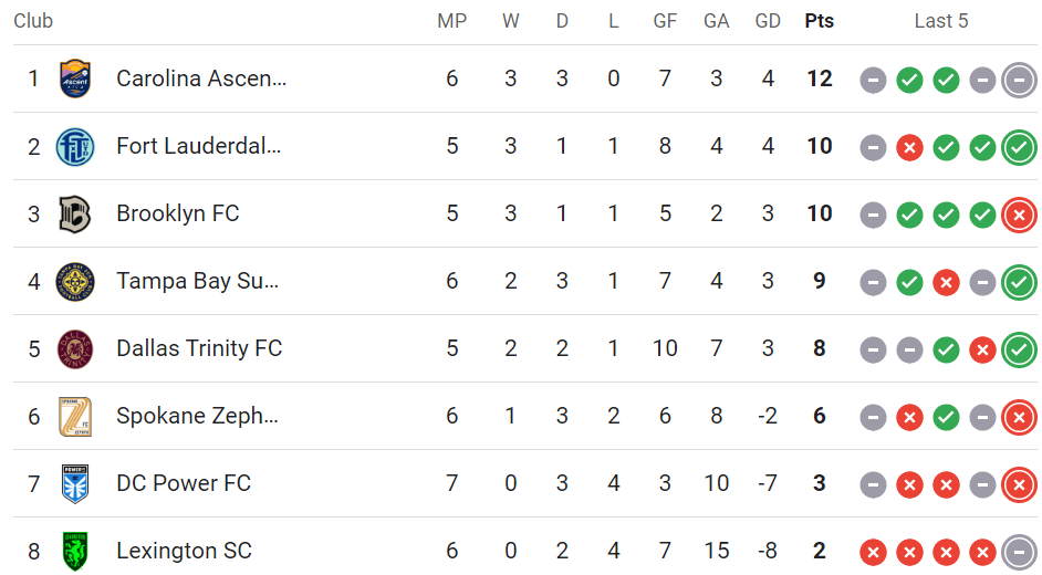 Current USL Super League Standings